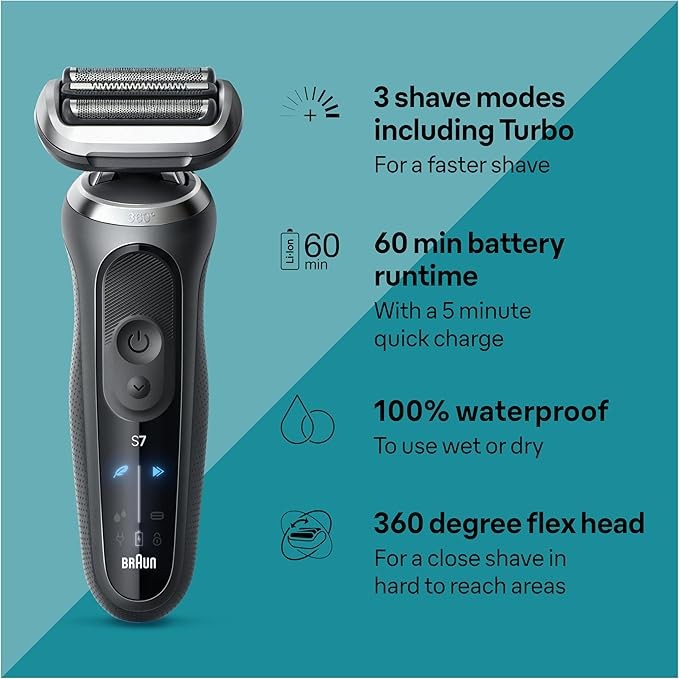 Braun Electric Shaver for Men, Series 7 7185cc, Wet & Dry Shave, Turbo & Gentle Shaving Modes, Waterproof Foil Shaver, Space Grey