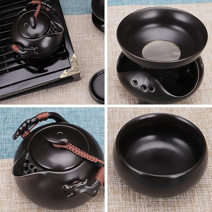 fanquare Chinese Black Ceramic Kung Fu Tea Set with Tea Tray and Small Tea Tools,Porcelain Tea Service