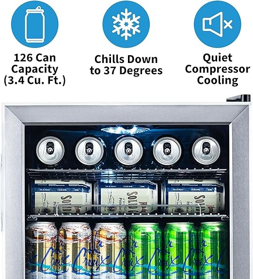 NewAir Beverage Refrigerator Cooler 126 Cans Free Standing with Right Hinge Glass Door Mini Fridge Beverage Organizer Perfect For Beer, Wine, Soda, And Cooler Drinks