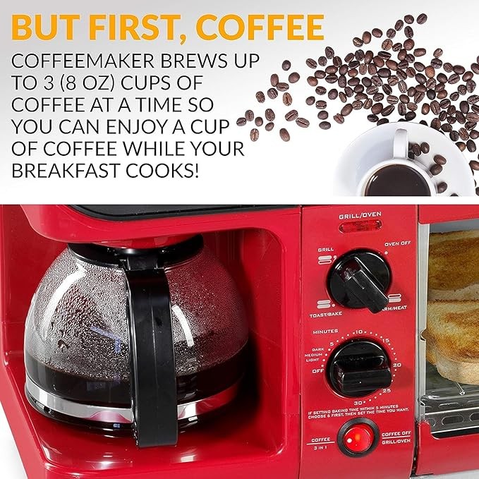Nostalgia 3-in-1 Breakfast Station - Includes Coffee Maker, Non-Stick Griddle, and 4-Slice Toaster Oven - Versatile Breakfast Maker with Timer - Red