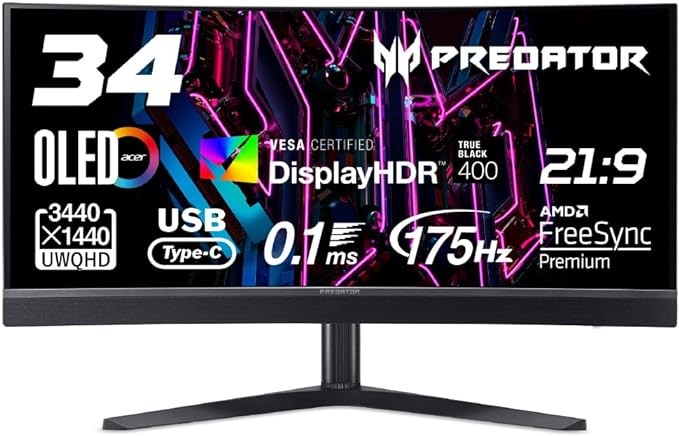 Predator Gaming Monitor 34 Curved 219 Ultra Wide OLED Matte 175Hz 0.1ms USB Type-C 65W Powered KVM Height Adjustable VESA DisplayHDR True Black 400 X34Vbmiiphuzx