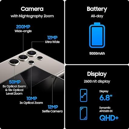 SAMSUNG Galaxy S24 Ultra Cell Phone, 256GB AI Smartphone, Unlocked Android, 50MP Zoom Camera, Long Battery Life, S Pen, US Version, 2024, Titanium Gray