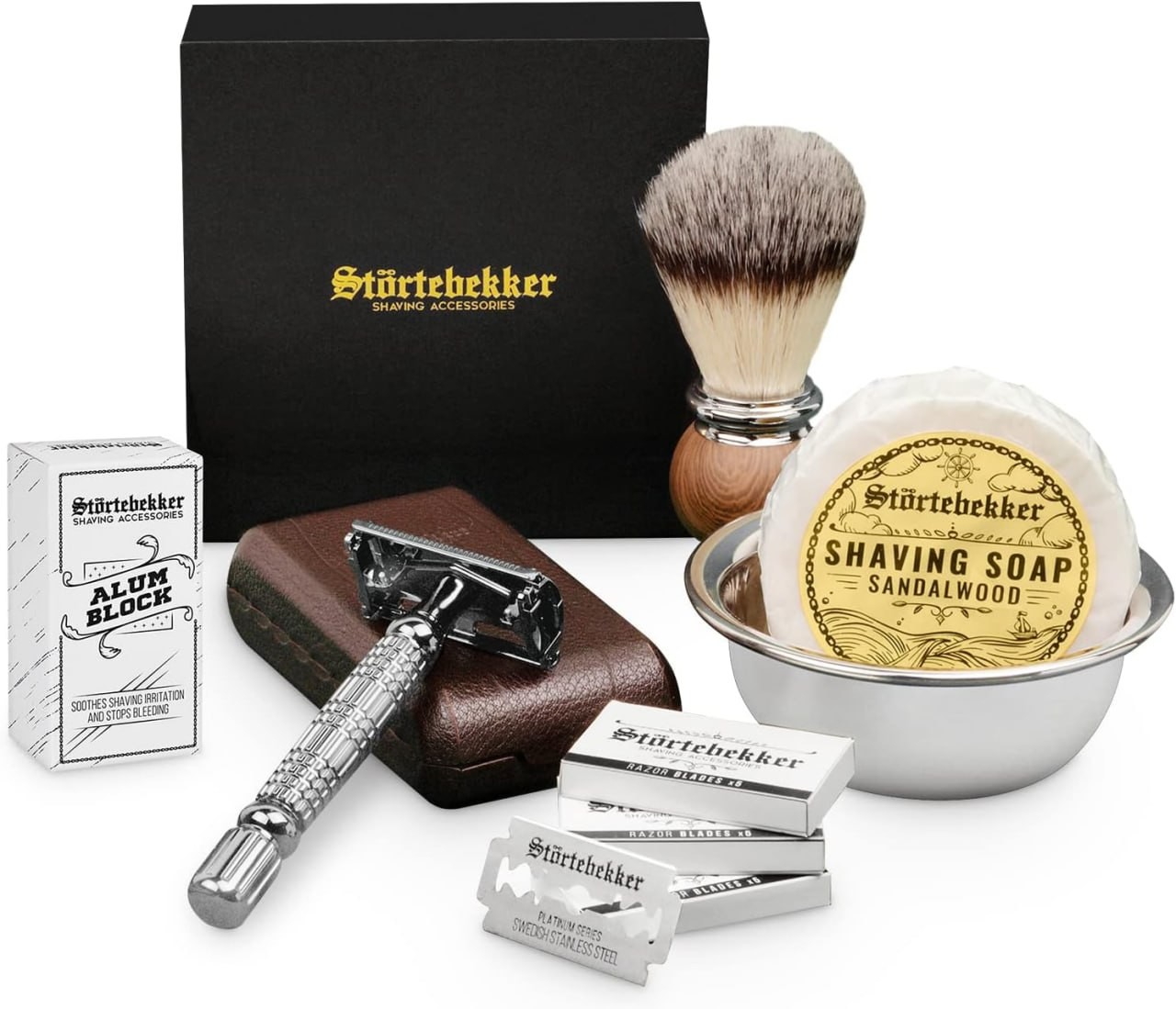 Störtebekker® Premium Safety Razor Set for Men in Handmade Leather Case - Shaving Set with Shaving Brush, Shaving Bowl Stainless Steel, Shaving Soap, Alum Stone and Razor Blades - Beard Care Set Men