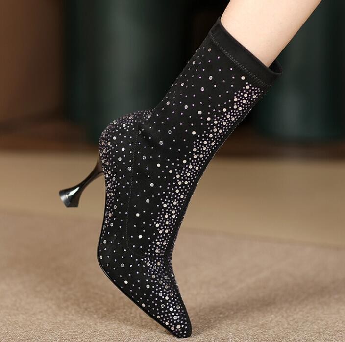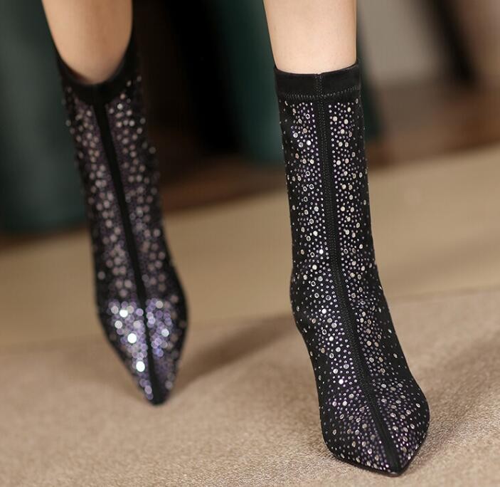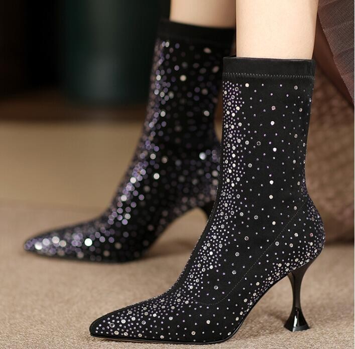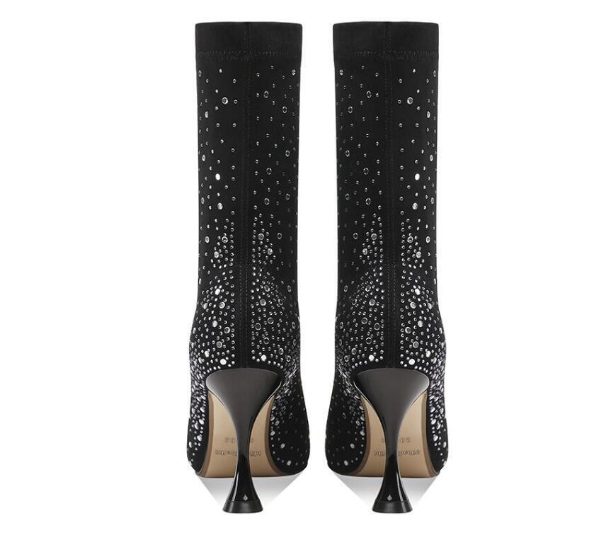 Womens Fashion Pointy Toe Diamante Stretchy Ankle Boots High Heels Party Shoes